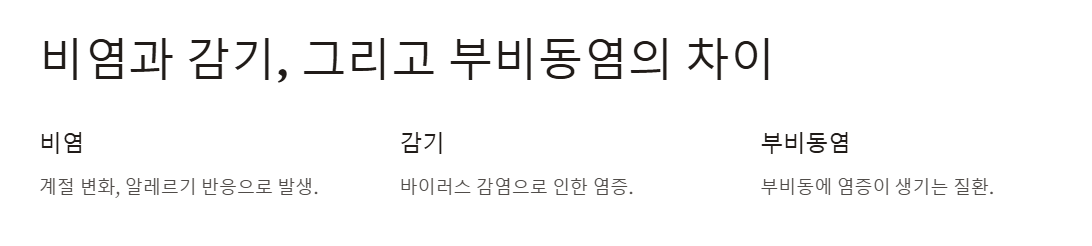 비슷해 보이지만 비염, 감기, 부비동염은 원인과 증상이 달라요. 아래 표를 보고 본인의 상태를 확인해 보세요!